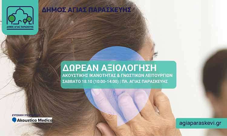 Ο Δήμος Αγίας Παρασκευής, στο πλαίσιο της διαρκούς μέριμνας για την υγεία και την ποιότητα ζωής των πολιτών, σε συνεργασία με την Acoustica Medica, διοργανώνει το Σάββατο 18 Οκτωβρίου, από τις 10:00 έως τις 14:00, στην κεντρική πλατεία της πόλης, δωρεάν σύντομες αξιολογήσεις ακουστικής ικανότητας. Επίσης, θα διενεργούνται και τεστ αξιολόγησης βασικών γνωστικών λειτουργιών (για άτομα άνω των 60 ετών).