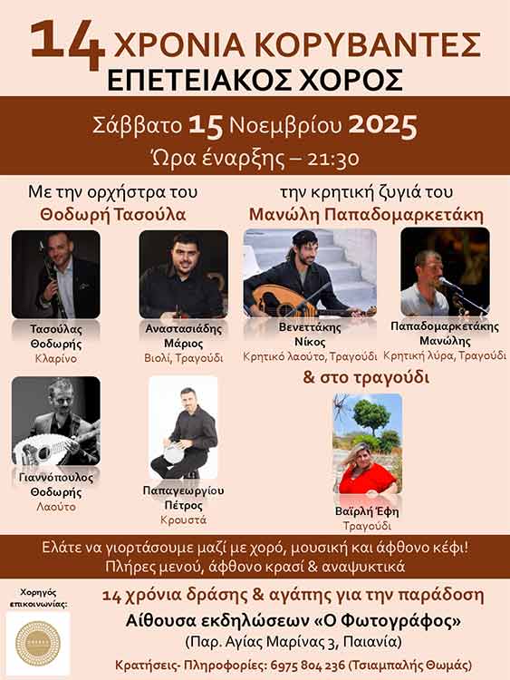 Ο Πολιτιστικός Σύλλογος Αγίας Παρασκευής «Κορύβαντες» γιορτάζει φέτος 14 χρόνια δράσης και αγάπης για την παράδοση και μας προσκαλεί στον επετειακό χορό του, το Σάββατο 15 Νοεμβρίου 2025, στις 21:30, στην αίθουσα εκδηλώσεων «Ο Φωτογράφος» (Παρ. Αγίας Μαρίνας 3, Παιανία).