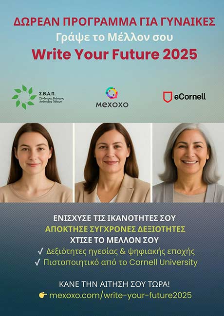 Ο Σύνδεσμος για τη Βιώσιμη Ανάπτυξη των Πόλεων (ΣΒΑΠ) ανακοινώνει μια σημαντική πρωτοβουλία υπέρ της γυναικείας ενδυνάμωσης και επαγγελματικής εξέλιξης, μέσα από την υπογραφή Μνημονίου Συνεργασίας με τον μη κυβερνητικό οργανισμό Mexoxo. Η συνεργασία αφορά στη διάθεση του κορυφαίου προγράμματος «Write Your Future 2025» στις γυναίκες που κατοικούν στους 16 Δήμους-μέλη του Συνδέσμου.