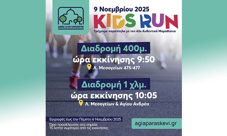 Με αφορμή την πραγματοποίηση του 42ου Αυθεντικού Μαραθωνίου της Αθήνας, που διοργανώνει ο ΣΕΓΑΣ με τη στήριξη της Περιφέρειας Αττικής το διήμερο 8-9 Νοεμβρίου, ο Δήμος Αγίας Παρασκευής διοργανώνει, την Κυριακή 9 Νοεμβρίου 2025, τον δικό του Αγώνα Δρόμου Μικρών Παιδιών στην αυθεντική μαραθώνια διαδρομή, στο ρεύμα καθόδου της Λεωφόρου Μεσογείων με κατεύθυνση το κέντρο της Αθήνας.