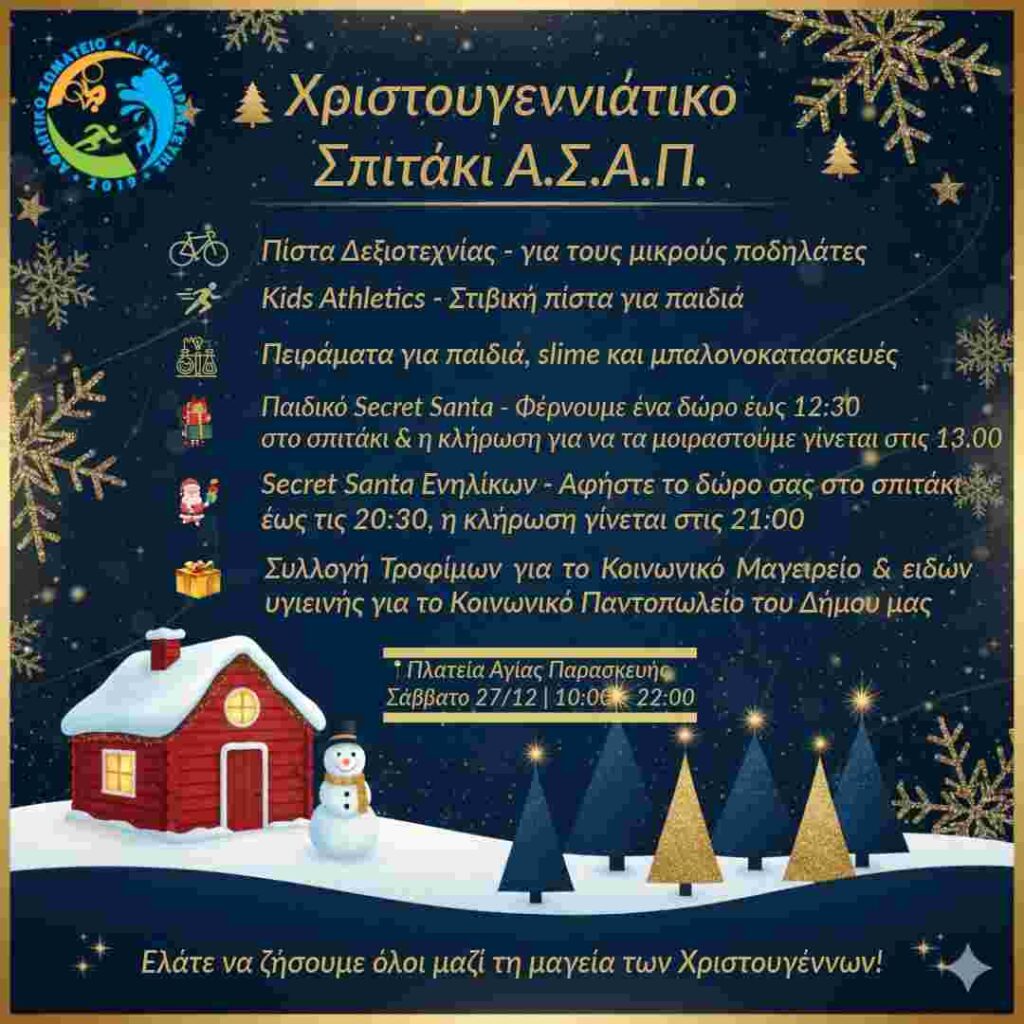 Το Διοικητικό Συμβούλιο του Αθλητικού Σωματείου Αγίας Παρασκευής (ΑΣΑΠ) προσκαλεί το κοινό στο χριστουγεννιάτικο σπιτάκι των συλλόγων, στο πλαίσιο της Χριστουγεννιάτικης Πολιτείας Αγίας Παρασκευής 2025. Η εκδήλωση θα πραγματοποιηθεί το Σάββατο 27 Δεκεμβρίου, από τις 10:00 έως τις 22:00 στην κεντρική πλατεία.