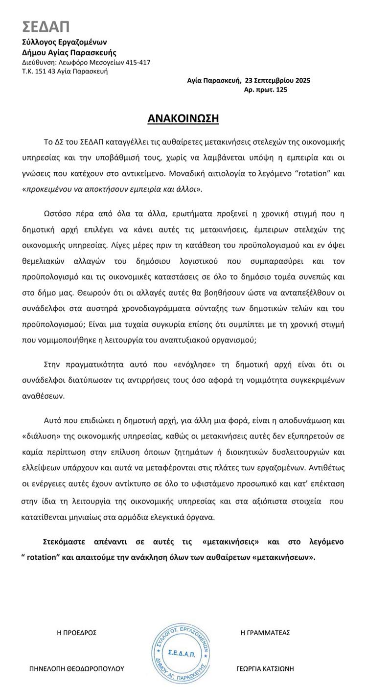 Νέες πολιτικές φωτιές ανάβει στην Αγία Παρασκευή μία ανακοίνωση του Συλλόγου Εργαζομένων του Δήμου (ΣΕΔΑΠ), σύμφωνα με την οποία η δημοτική αρχή του Γιάννη Μυλωνάκη προχωρά σε αυθαίρετες μετακινήσεις στελεχών της οικονομικής υπηρεσίας, προβάλλοντας ως δικαιολογία -όπως λένε οι εργαζόμενοι- το λεγόμενο «rotation», προκειμένου να αποκτήσουν εμπειρία και άλλοι υπάλληλοι.