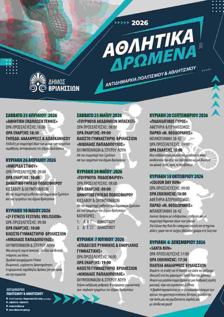 Ο Δήμος Βριλησσίων ανακοινώνει το ετήσιο πρόγραμμα αθλητικών δράσεων «Αθλητικά Δρώμενα 2026», μία σειρά εκδηλώσεων που προάγουν τη φυσική άσκηση, την ευεξία και τη συμμετοχή πολιτών όλων των ηλικιών.