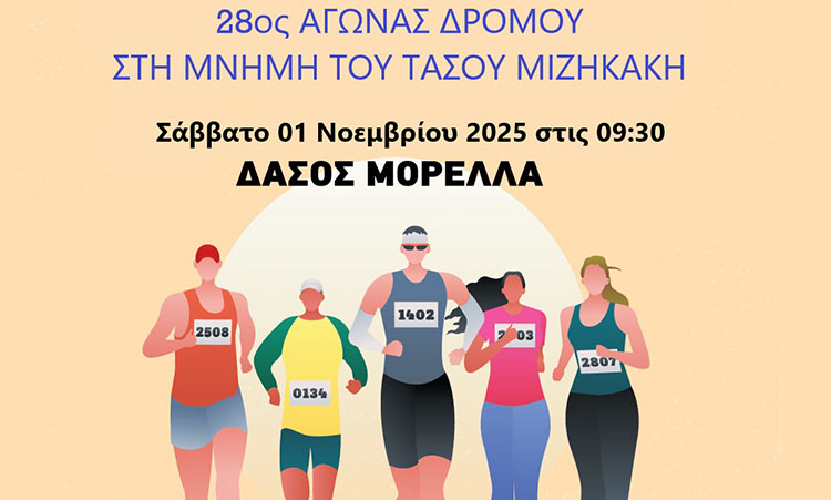 Ο Δήμος Λυκόβρυσης – Πεύκης διοργανώνει τον 28ο Αγώνα Δρόμου αφιερωμένο στη μνήμη του Τάσου Μιζηκάκη στο Δάσος Μορέλλα, στην Πεύκη, το Σάββατο 1 Νοεμβρίου 2025 και ώρα 09:30.
