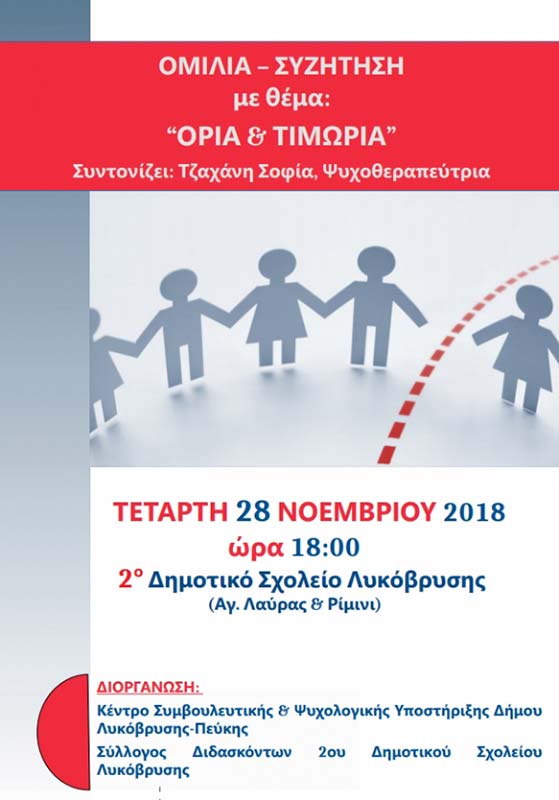 Το Κέντρο Συμβουλευτικής και Ψυχολογικής Υποστήριξης του Τμήματος Κοινωνικής Προστασίας του Δήμου Λυκόβρυσης – Πεύκης και ο Σύλλογος Διδασκόντων του 2ου Δημοτικού Σχολείου Λυκόβρυσης διοργανώνουν ομιλία με θέμα «Όρια & τιμωρία» την Τετάρτη 28 Νοεμβρίου 2018 στις 18:00 στην αίθουσα εκδηλώσεων του 2ου Δημοτικού Σχολείου Λυκόβρυσης (Αγ. Λαύρας & Ρίμινι).