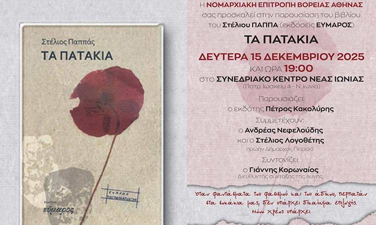 Παρουσίαση του βιβλίου του Στέλιου Παππά «Τα Πατάκια» στη Νέα Ιωνία