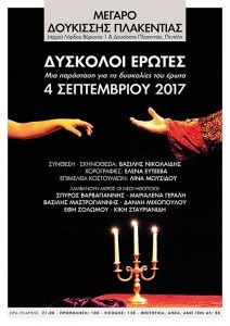 Η παράσταση «Δύσκολοι Έρωτες» θα παρουσιαστεί τη Δευτέρα 4 Σεπτεμβρίου 2017, στις 21:00, στο Μέγαρο Δουκίσσης Πλακεντίας στην Πεντέλη (Τέρμα Λόρδου Βύρωνος), στο πλαίσιο του πολιτιστικού θεσμού του Δήμου Πεντέλης «Πολιτιστικός Σεπτέμβριος 2017».