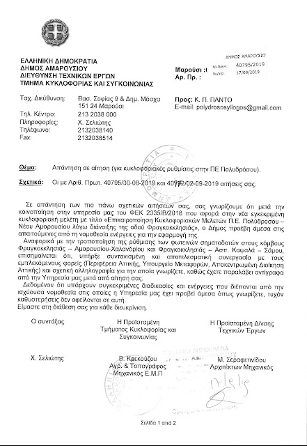 Έγγραφο προς τον Σύλλογο Πολυδρόσου απέστειλε χθες, Τρίτη 17 Σεπτεμβρίου 2019, με ηλεκτρονικό ταχυδρομείο, η Τεχνική Υπηρεσία του Δήμου Αμαρουσίου, με το οποίο εξηγεί και ενημερώνει τους κατοίκους της περιοχής για τις καθυστερήσεις της εφαρμογής των κυκλοφοριακών ρυθμίσεων.